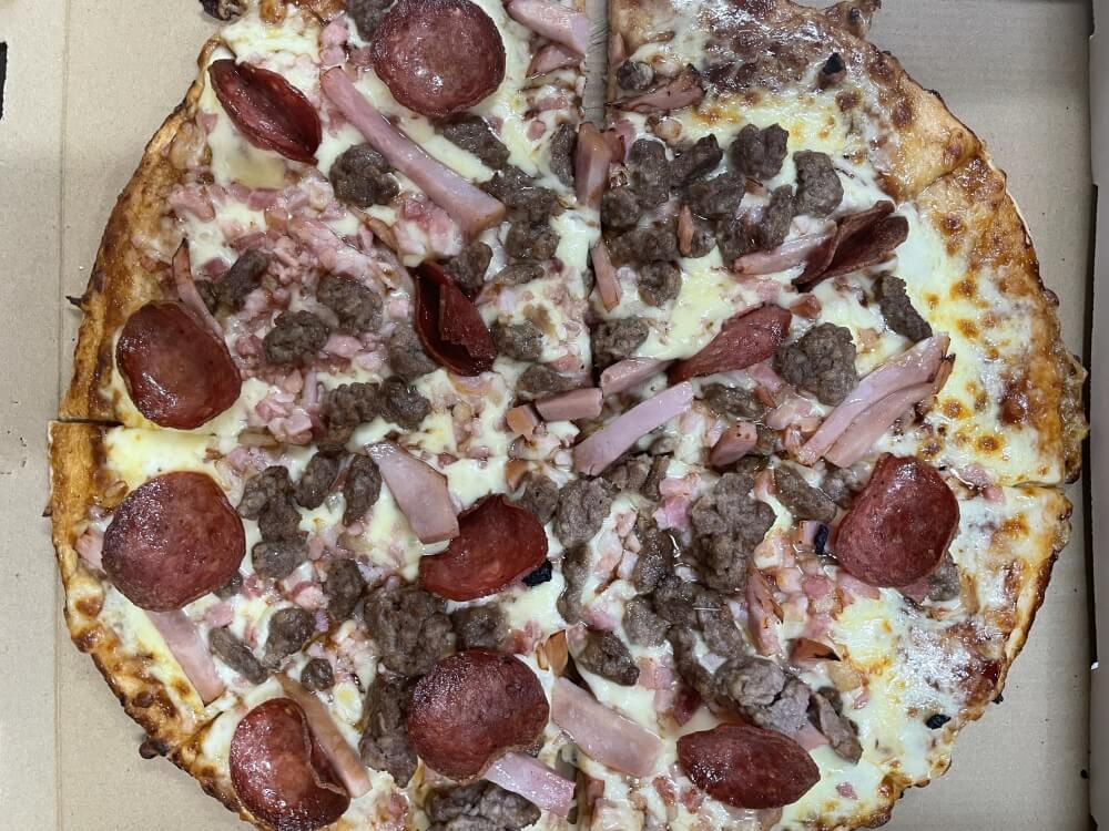 Ham, Bacon, Pepperoni, Ground Beef on a BBQ sauce base with mozzarella cheese.