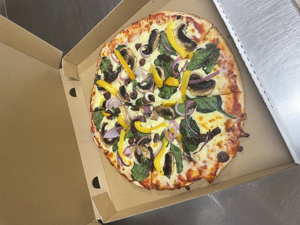 Mushroom, capsicum, red onion, sundried tomatoes, olives, baby spinach on a tomato base with mozzarella.